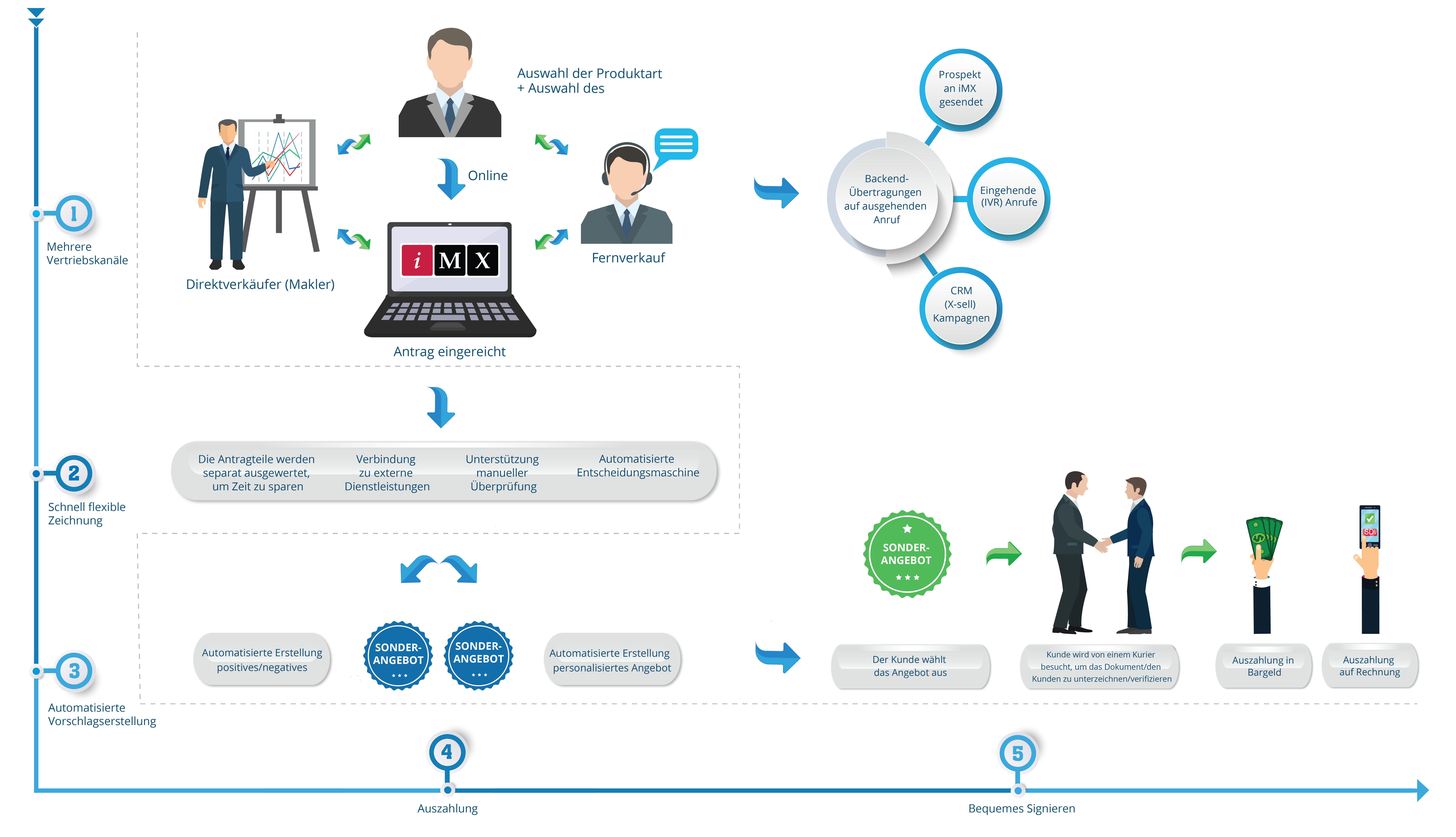 iMX ist in der Lage, ein sofort einsatzbereites, leicht konfigurierbares E2E-System für die Verbraucherfinanzierung bereitzustellen, das sowohl Prospektierung (LEAD- und X-SELL-Campaigns), Neuankauf, umfassende Kreditprüfung, automatisierte Angebotserstellung (einschließlich positiver/negativer Alternativen) als auch Vertragserstellung, Unterzeichnungs- und Wettbewerbsverfahren, Auszahlungs- und Inkassoprozesse vollständig abdeckt.