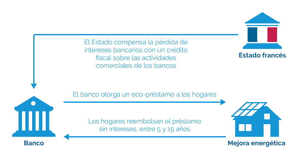 La Eco-PTZ es un ejemplo de incentivos introducidos en 2009. El principio permite financiar renovaciones energéticas mediante un plan de préstamos ecológicos a tipo cero. El principio se expone en el siguiente esquema: