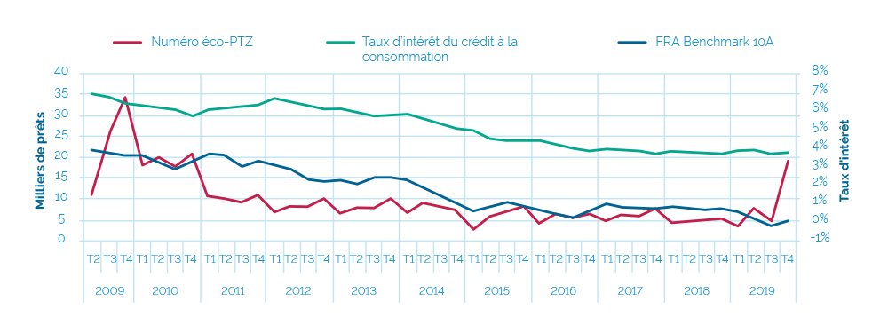 Le graphique ci-dessous montre le nombre de prêts EPTZ empruntés depuis le début de cette incitation. Cependant, le taux d’emprunt de ce type de prêts est plus faible que prévu, notamment pour la période précédant la crise du COVID-19.