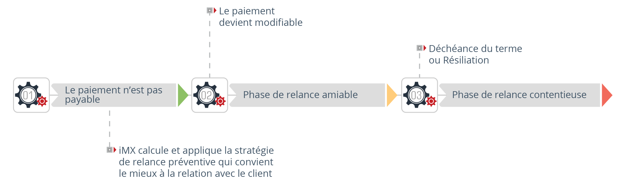 iMX met à disposition d’importantes possibilités de paramétrage, à l’aide de ses outils avancés de Scoring et de segmentation, sans oublier la faculté pour l’utilisateur d’adapter ses stratégies de relance préventives en fonction des situations rencontrées.